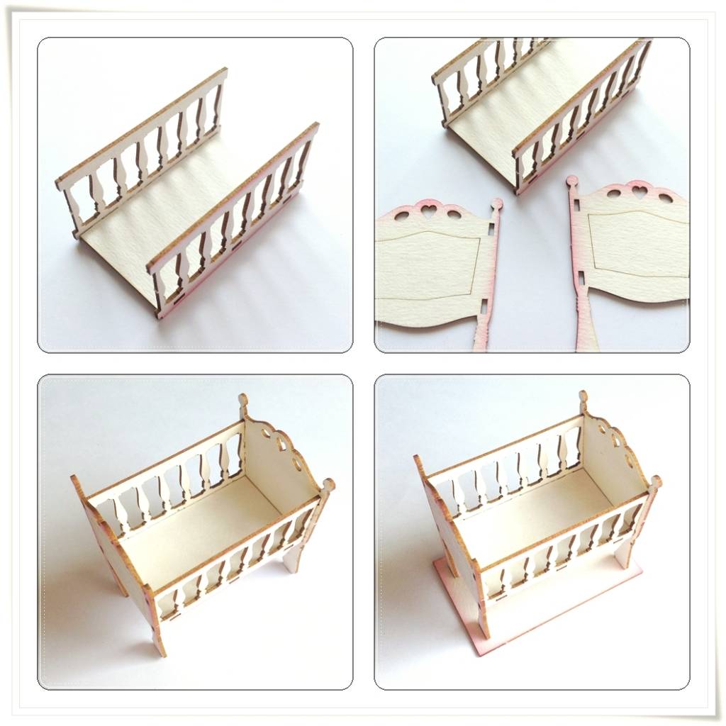 Embellishments / Verzierungen Laser gesneden spaanplaat: 3D wieg / bed met Baby Accessoires